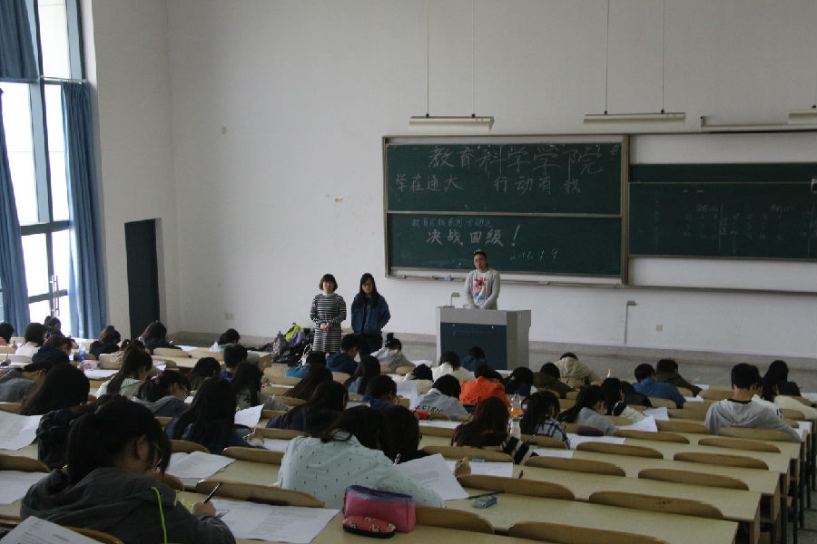 4月9日,在距离全国大学英语四级考试两个多月之际,QY球友会举办了“学在通大,行动有我”教育实践系列活动之“决战四级”英语模拟考试。考试在下午两点准时开始,主校区9号教学楼302、303教室大约容纳了参加模拟考试的300多名同学。本次考试主要针对教科院大一年级新生,旨在为同学们提供一个实战模拟考场,让大家提前感受英语四级的题型和模式,力争在第一次英语四级考试中获得佳绩。