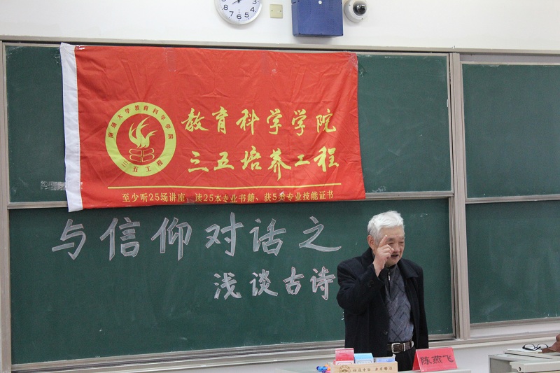 4月12日下午,QY球友会特邀球友会官方网站退休教师、书法研习社指导老师陈燕飞做客三五讲座之与信仰对话“浅谈古诗词”。本次讲座于球友会官方网站主校区4号楼205室举办,有来自学前师范、小学教育师范、应用心理以及教育技术专业等多个专业约280余名同学参加。