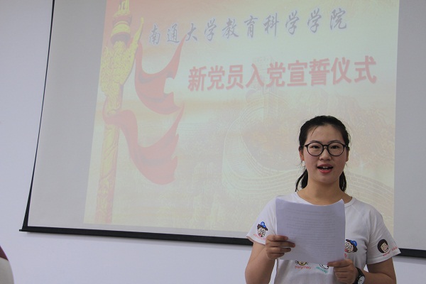 会议伊始,全体起立,奏国际歌。院团委书记魏琳老师公布了参加此次新党员宣誓的35名新党员名单,并由魏老师领誓,带领35名新加入党组织的预备党员,举起右拳,庄严地宣读了自己的入党誓词。学前152的孙雨溪同学代表新党员郑重向党组织承诺:加强学习,不断提高为党组织服务的本领;牢固树立全心全意为人民服务的思想,为实现共产主义奋斗终身。老党员代表教技131的袁佳宇同学结合自己的考研经历和担任班长的工作实际,希望新党员同学能时刻谨记党员身份,从小事做起,踏实学习,认真工作,不贪图个人私利,吃苦在前,努力为大家服务,处处体现党员的先锋模范作用。