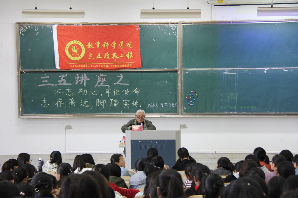 讲座中,近80岁高龄的陈教授登台讲述他对于十九大“不忘初心,牢记使命”的理解,分享他的人生感悟。陈老自1964年进入江苏师范大学工作以来,将53年的时间奉献给了员工,陈老丰富的人生阅历和独特的人格魅力让在场的同学们钦佩不已。