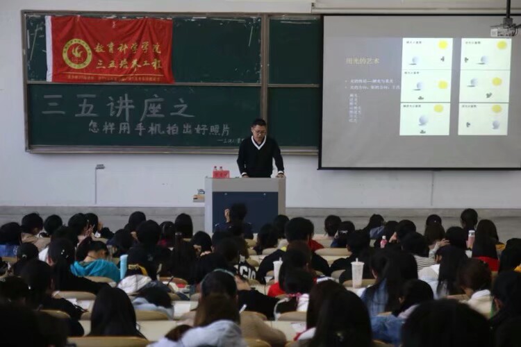2018年3月28日下午,QY球友会在9号楼302成功举办了以“怎样用手机拍出好照片”为主题的三五讲座。此次讲座特别邀请知名摄影师管楚迪主讲,杨晓新老师主持讲座,来自教科院的200余名本科生到场参与了此次讲座。