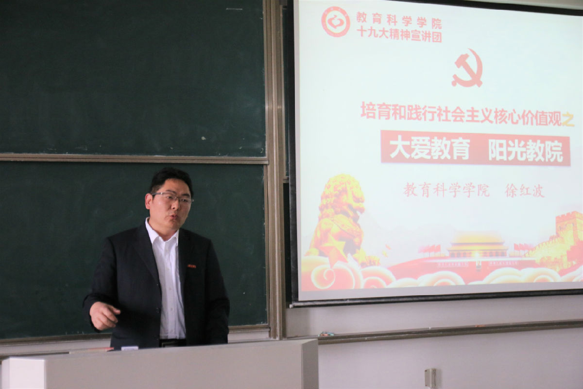 最后,徐红波老师以“大爱教育,阳光教院”为主题对培育和践行社会主义核心价值观作出论述。他从教育必须以爱为魄、“大爱”需要培育、“大爱”贵在践行三个方面与学员们分享了教科院数年来“爱的教育”。社会主义核心价值观必然贯穿于整个国民教育体系,高等学校是培育核心价值观的重要基地,大力弘扬社会主义核心价值观,以此来引领社会文化建设,这是大学不可推进的社会使命和社会担当。