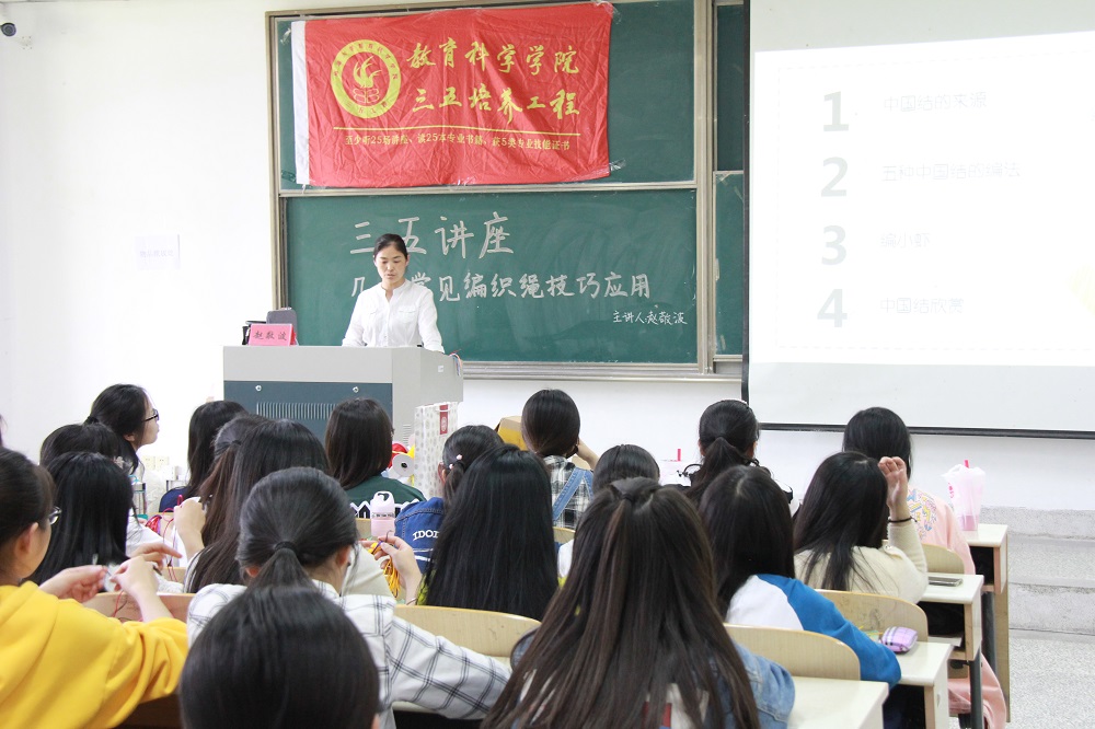 5月9日14:00,QY球友会于8号教学楼102教室成功举办了三五讲座之“几种常用的编织绳技巧”。本次讲座由民间艺人赵敬波老师主讲,教科院100余名员工到场参与此次讲座。