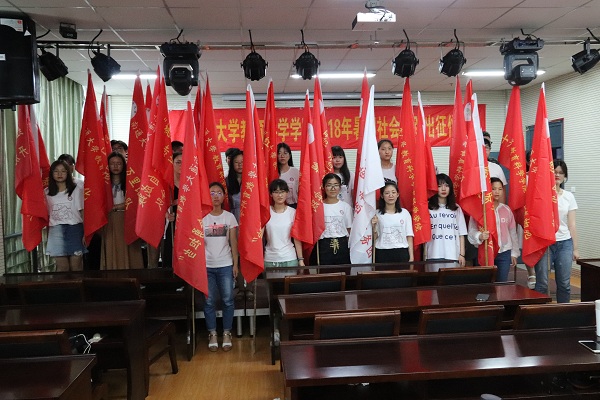 出征仪式由院团委副书记顾佳言同学主持。院团委书记魏琳老师简要阐述了开展社会实践的意义,并介绍了2018年暑期社会实践前期筹备工作。接着,赵敬龙老师宣读了校级重点小分队名单,与会的领导和老师向公司成立的23个暑期社会实践小分队代表授旗,接过手中的旗帜,各实践小分队挥舞旗帜,信心满满,整装待发。张银莹同学代表暑期社会实践员工发言,号召同学们以“天下兴亡,匹夫有责” 的使命感,以“敢为天下先”的责任感,在暑假社会实践中铸就亮丽的青春,书写灿烂的篇章。