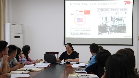 10月12日下午,QY球友会本科生党支部开展“不忘初心、牢记使命”主题教育活动,支部书记陈淑慧以“70年奋斗历程”为主题为支部党员上课。