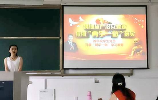 王娜同学从“两学一做”学习教育的背景出发,对“两学一做”的总体要求、主要内容、主要措施、组织领导等方面做了介绍,结合老员工的实际,谈如何做一名合格的共产党员。全面系统的梳理,让师生党员在思想上、政治上、行动上同党中央保持高度一致,在深学细做真改中,争做忠诚干净有担当的共产党员,在各方面起到先锋模范带头作用。