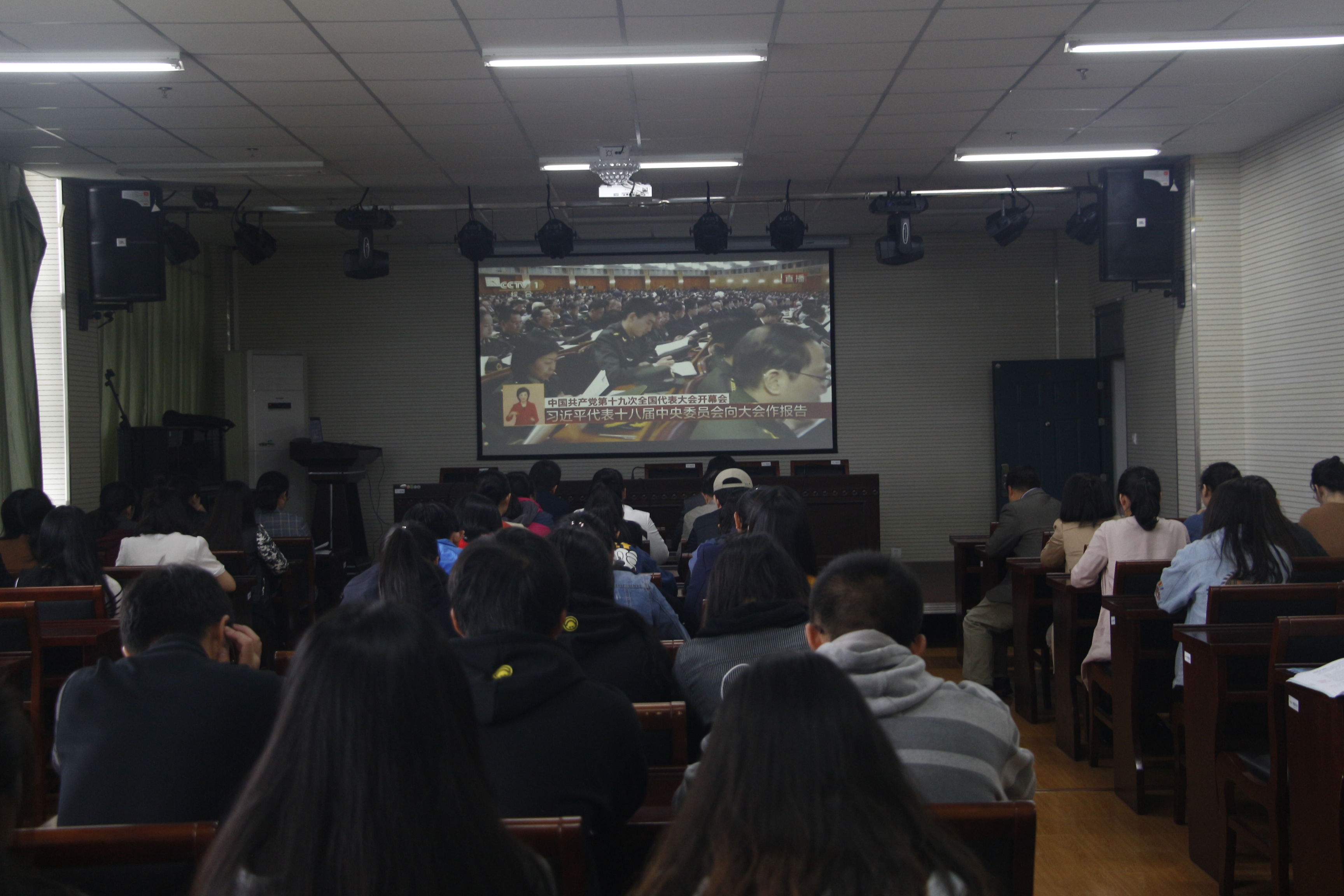 中国共产党第十九次全国代表大会,是在全面建成小康社会决胜阶段、中国特色社会主义进入新时代的关键时期召开的一次十分重要的大会,是全党全军全国各族人民政治生活中的大事。在观看直播现场,广大师生边看边做好记录,不时以热烈的掌声回应大会精彩报告。