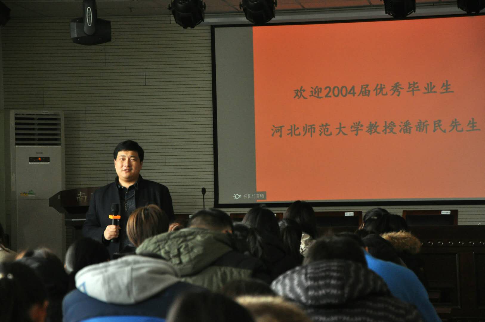 潘新民教授首先对母校的悉心培养和恩师的谆谆教导表示感谢。他深情地回忆了自己当年在校的学习生活,感概良多。他建议在校老员工要找到自己的兴趣点,以此制定目标,不断前行。他认为,人之所以会迷茫,正是因为没有目标,有了目标就可以持续不断的努力,有了目标的人生才会有动力。向着目标不断的努力,知行合一,才会获得成功。潘教授还向同学们分享了自己的考研经历,鼓励同学们大胆选择,认真复习,锁定目标,坚定信念,勇往直前。对于选择其他方向的同学,潘教授也给出了有针对性建议,希望不考研的同学也像自己同届的同学一样,在各自领域的发展成为社会的有用之才。