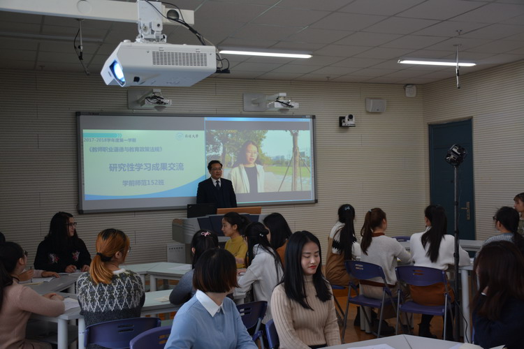 教学伊始,许映建老师利用手机慕课与同学们一起回顾了该课程的教学大纲,他让学习委员王娜组织同学们进行研究性学习成果展示。然后,张刘丽、周凯和严靓丹三位同学依次利用PPT和视频展示了他们小组对《教师仪容规范》、《员工的权利保护》、《教师的举止规范》三大课程要点的研究性学习成果,结合当今幼儿教师现状分别提出问题。最后,许映建老师夸奖了同学们完成作业的态度和作业质量,指出该课程的重要性,是师范生的专业基础必修课程,是国家教团队格考试和教师应聘考试的必考内容,更是教师必备的素养要求。