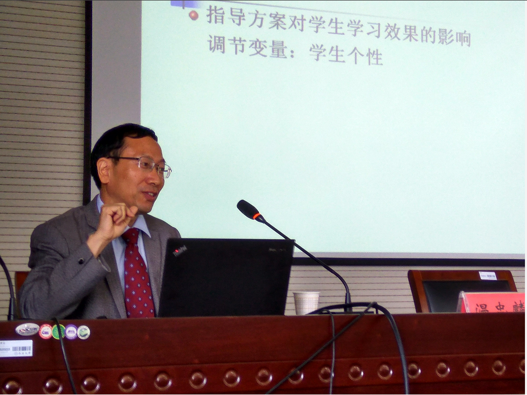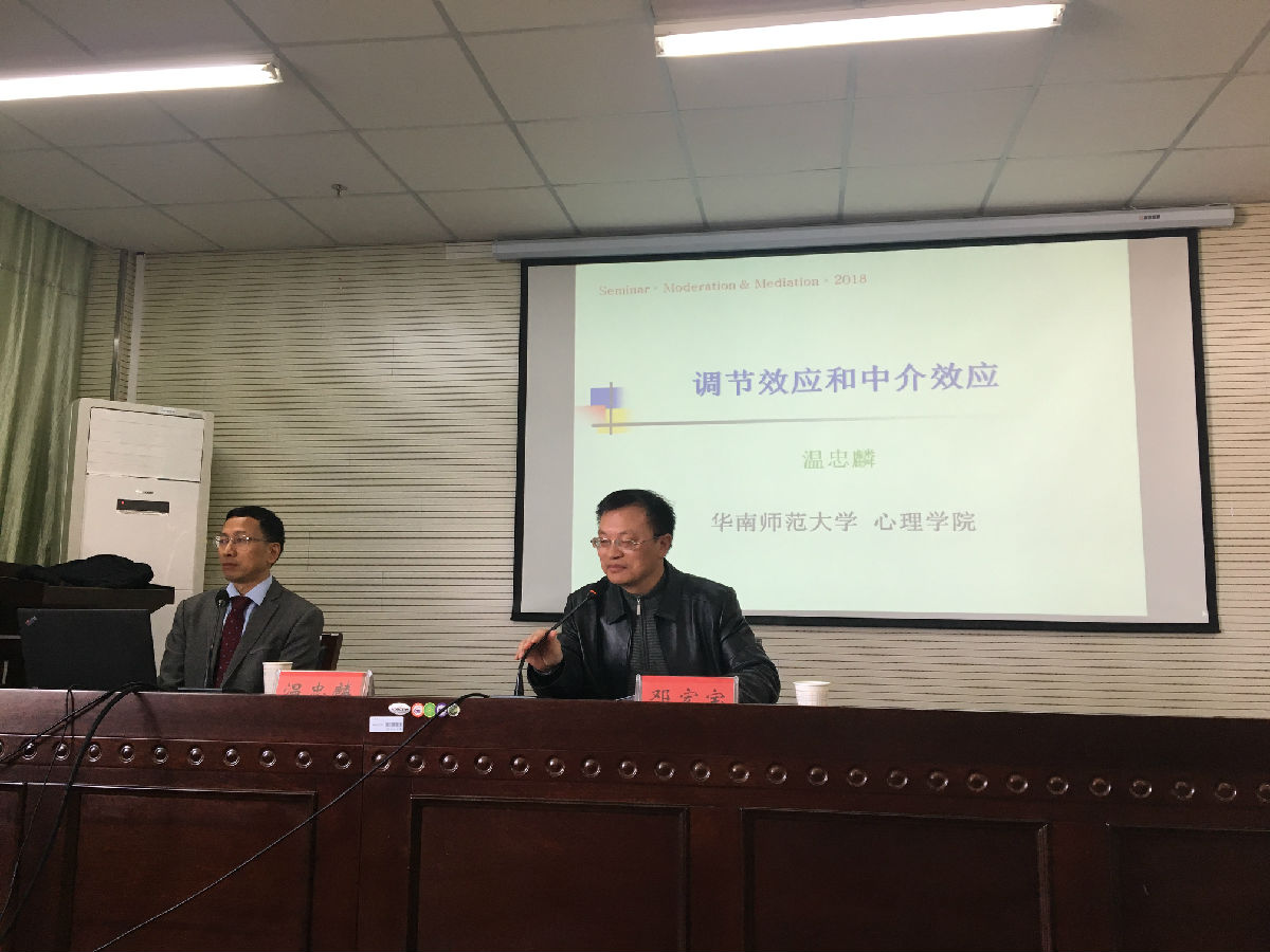 上午的学术报告会由QY球友会邓宏宝教授主持。报告主题为“因果关系中的第三者——调节变量和中介变量”,共分为两个部分,第一部分为调节效应与交互效应,第二部分为中介效应模型及其分析。从调节变量和中介变量的界定到两者之间的关系,再到调节和中介效应分析,以及效应检验程序及应用。在对Baron和Kenny逐步法的质疑和辨析的基础上,详细介绍了Bootstrap法检验程序。温教授的讲解深入浅出,在研究方法的讲解中加入教育中的相关案例,风趣幽默,带领教科院师生领略统计方法在心理学研究中的魅力。