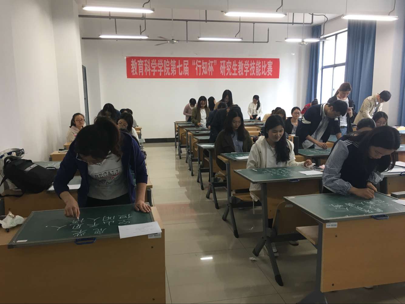 本次比赛共分为三个环节,分别是钢笔字、粉笔字书写,即兴演讲和微课比赛。比赛分为两组在两个教室分别进行,在主持人介绍完评委老师和比赛规则之后,各位选手开始了粉笔字和钢笔字的比赛,比赛时间共十五分钟,结束后由工作人员统一收取,交由评委老师点评、打分。演讲比赛计时三分钟,演讲主题由抽签决定,结束后由评委老师打分。最后根据各环节分数乘以相应比例算出总得分,决定排名和奖项。比赛现场气氛热烈,同学们扎实的基本功和良好的精神风貌获得了现场老师的一致好评。精彩的微课视频更体现了同学们精心的备课和对此次比赛的重视。