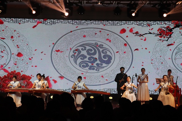公司民乐团合奏《爱我中华》和《渔舟唱晚》
