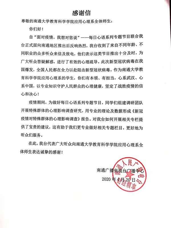 感谢信中写到:每日心语系列活动联合我台正式面向南通地区推出后反响热烈,我台收到了来自不同年龄、不同职业的众多听众来信及致电,他们表示这类节目推出十分及时,为广大听众答疑解惑,进行了有效的心理疏导。疫情期间,你们组建调研团队开展特殊群体的心理影响调查研究,用专业的理论及数据形成《新冠疫情对特殊群体的心理影响调查》报告,对我台如何开展相关专栏提供了宝贵的建议。作为QY球友会应用心理系的员工,你们有本领、有担当,心系武汉、心系中国,以专业知识守护人民群众的心理健康,坚定了战胜疫情的信心和决心!