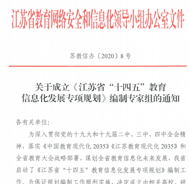 5月13日,江苏省教育网络安全和信息化领导小组办公室发布关于成立《江苏省“十四五”教育信息化发展专项规划》编制专家组的通知,公司钱小龙教授、贺斌教授,作为成员加入专家组。