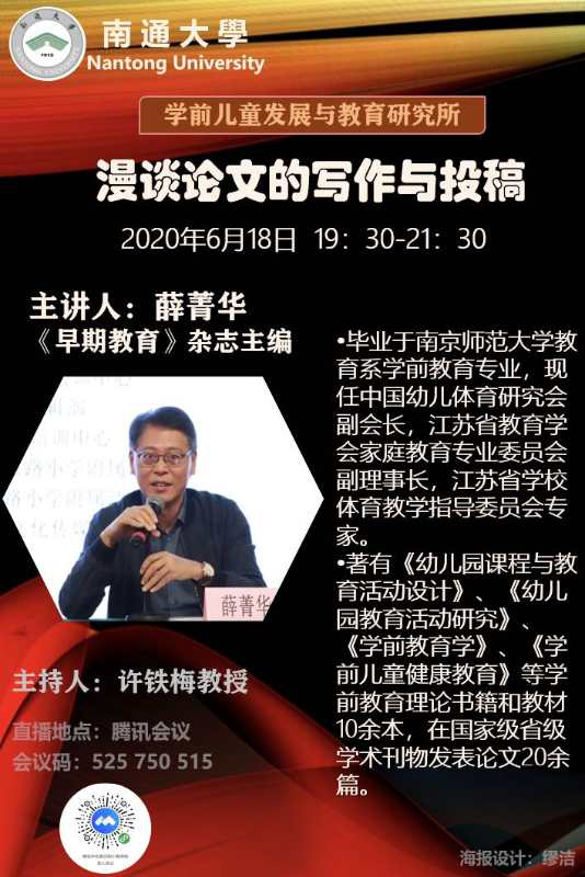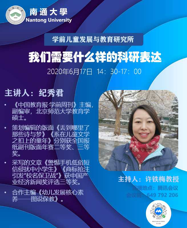 学前儿童发展与教育研究所相继开展题为“我们需要什么样的科研表达”、“漫谈论文的写作与投稿”的线上学术研讨活动,活动由学院副经理、研究所所长许铁梅主持,分别邀请《中国教育报学前周刊》主编纪秀君、《早期教育》杂志主编薛菁华进行了分享,校内外百余名师生与会聆听。纪晓君介绍了期刊的创始以及面向的对象,对期刊对选稿的定位、选题、版面要求、需要稿件的特征进行了详实的介绍,特别是与本次活动参与者密切相关的管理版及保教版的选题、写作、投稿要求,更是做了具体的讲解。薛菁华围绕论文的写作与投稿,就论文该“写什么”、“怎么写”、“如何投稿”三个具体问题进行了深入浅出的讲解。本次活动内容充实,贴合研究工作的实际需求,为与会师生的选题、撰稿、投稿均具有积极的促进作用。
