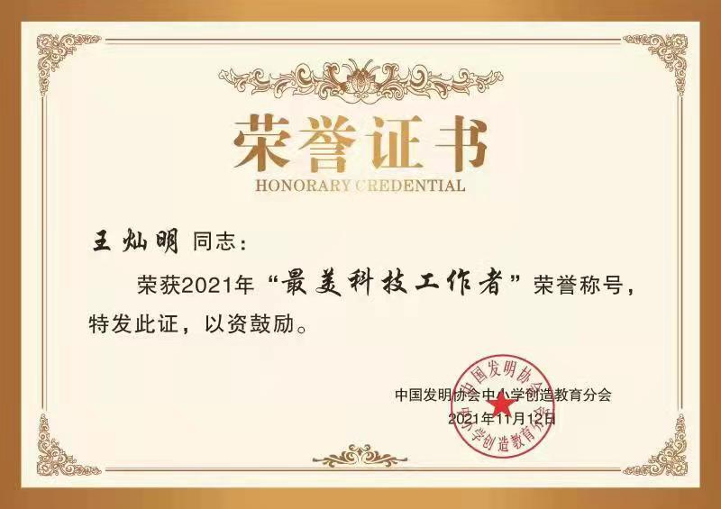 为了庆祝建党一百周年,深入贯彻习近平新时代中国特色社会主义思想和党的十九大精神,激发广大创新创造教育工作者的荣誉感、自豪感和责任感,中国发明协会中小学创造教育分会在全国范围内开展了“2021年度最美科技工作者”评选活动,11月12日结果公布,公司王灿明教授入选。