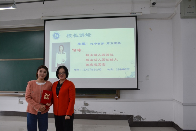 11月17日,南通市城山幼儿园创始人、首席运营官、园长何琦做客学院“董事长讲坛”,为学前教育专业的师生做了题为“心中有梦,前方有路”的专题讲座。